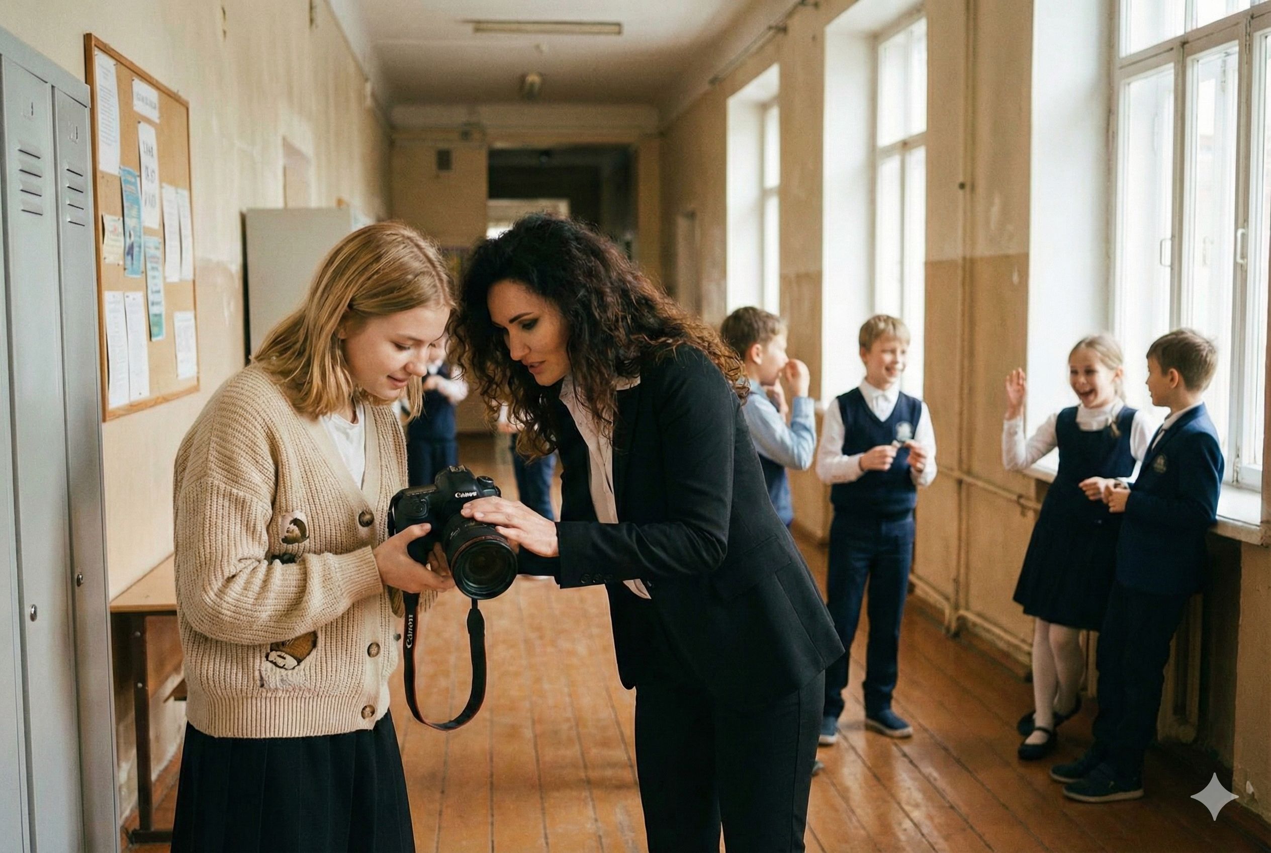 Олеся первой посмотрела на школьную съёмку как режиссёр: с сюжетом, атмосферой, характерами и эмоциями. В классбуке дети не позируют — они проживают сцену. Кадры выглядят как стоп-кадры из кино, а сам процесс съёмки становится точкой сближения класса и настоящим событием для детей.